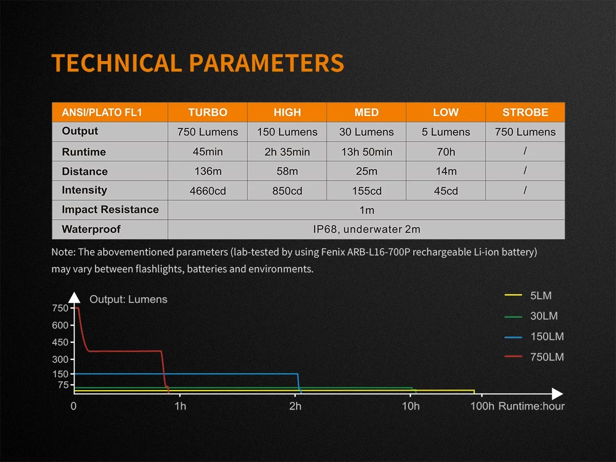 - Turbo: 750 lumens/45 min. (446 ft./136 meters)