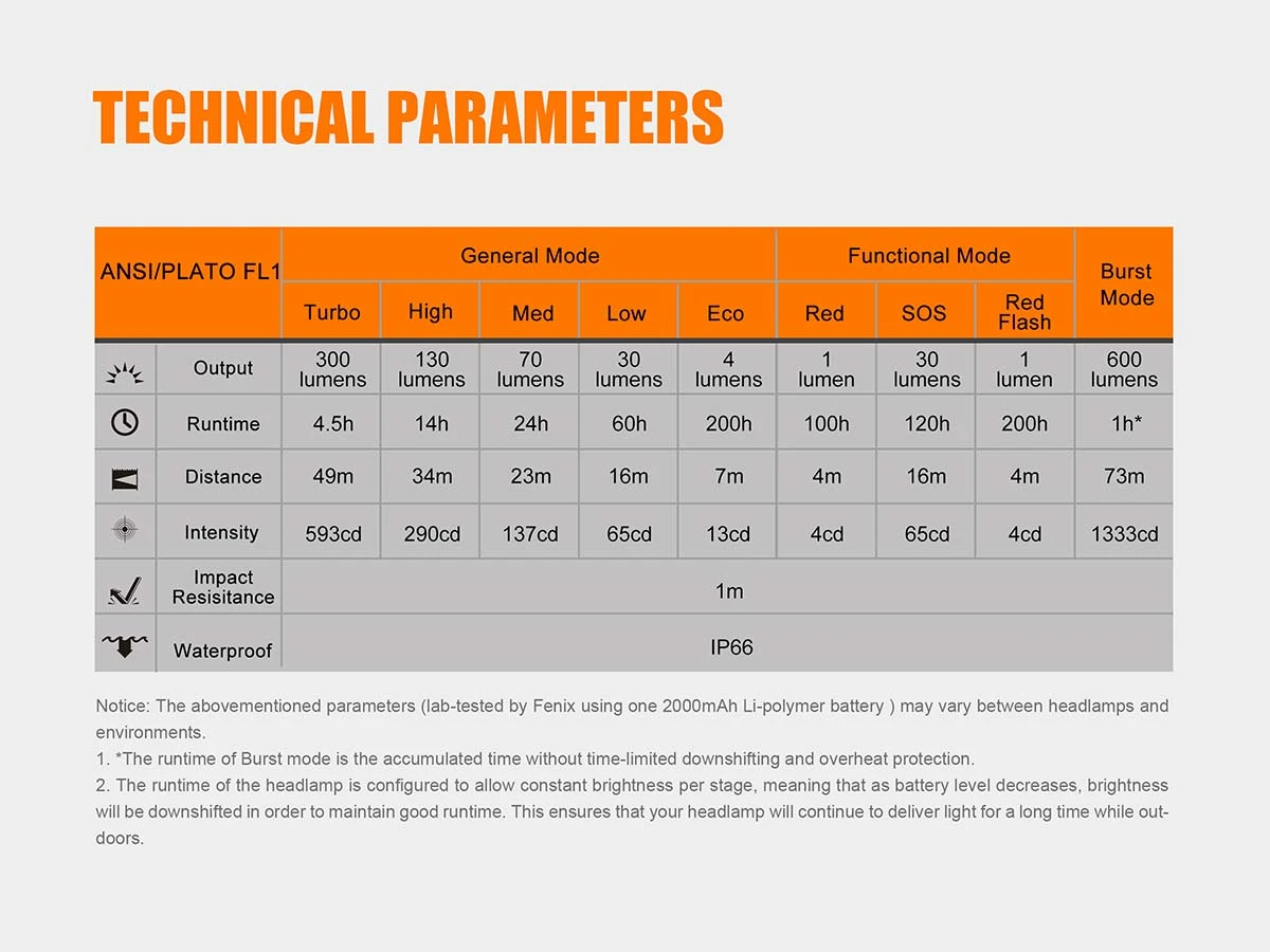 - Cree XP-G3 white light LED, with lifespan of 50,000 hours