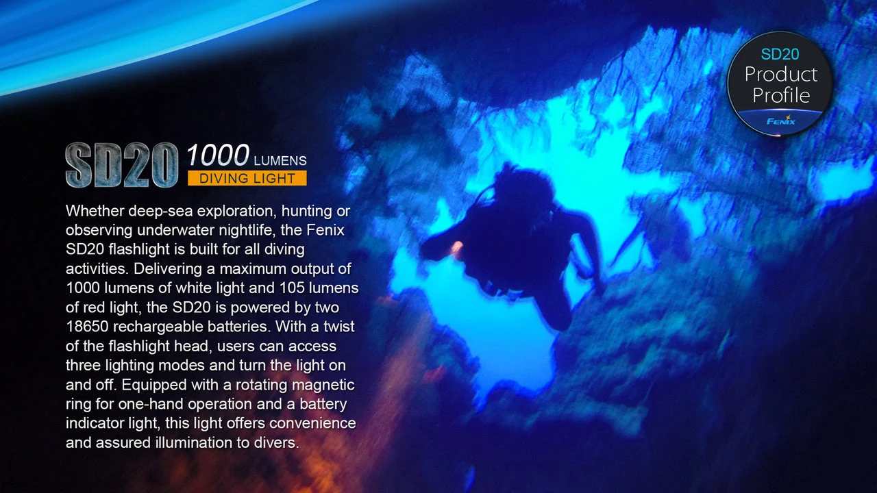 Ready for your underwater adventures–the new Fenix SD20 Dive Light. Whether deep-sea exploring or hunting/observing underwater nightlife, the SD20 flashlight is built for all diving activities. Need depth and distance from your dive light? With the SD20, you get a 332-foot depth rating along with a maximum 564-foot beam distance. The maximum 1000 Lumens of white light and 105 Lumens of red light are produced from two 18650 batteries. An added feature is the one-hand operation. Just twist the head to access three lighting modes. The SD20 is sure to be your go-to light for all your under water adventures.
