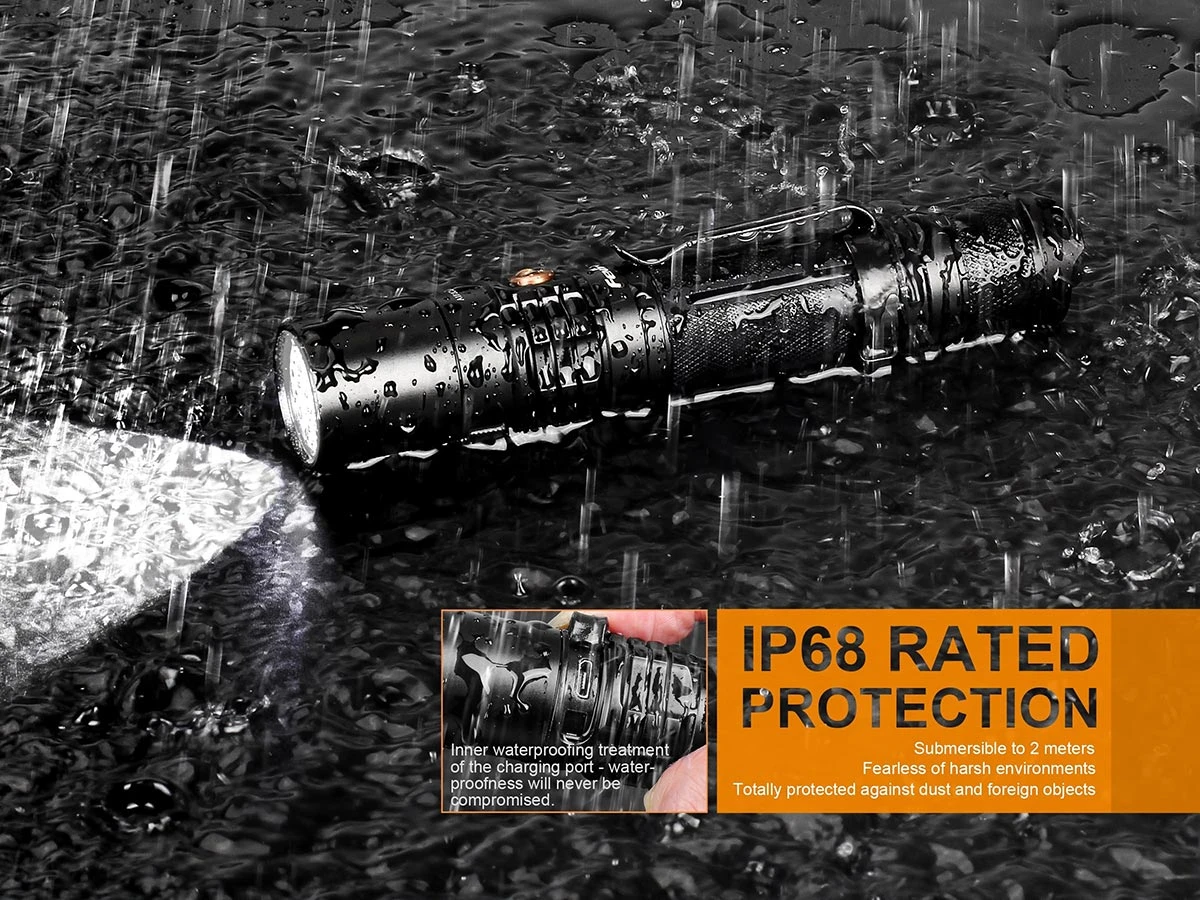 The Fenix UC35 V2.0 rechargeable flashlight is the 2018 upgrade to the Fenix UC35 flashlight. Fitted with the Cree XP-L HI V3 LED, this light delivers a maximum 1000 lumens at a distance of 873 feet (266 meters). Turn the light on and off with the tactical tail switch and cycle through the six lighting modes via the newly designed metal side switch—which also has a built-in battery level indicator. You can achieve an incredible 800 hours of runtime when using the new moonlight brightness level. Compact and built-tough, the UC35 V2.0 flashlight is IP68 rated; dust proof and waterproof underwater to two meters.