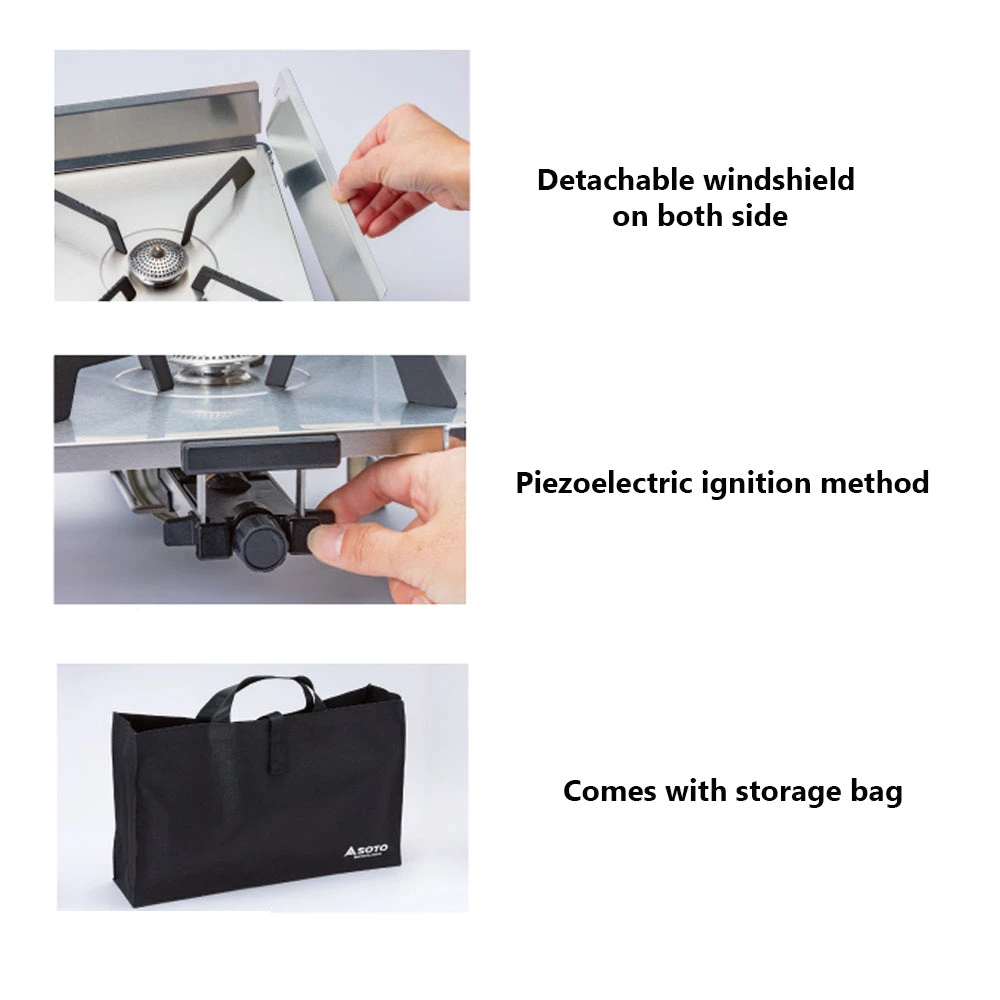 - Material:Â Main body: stainless steel | Trivet: iron | Stand/windshield (for back, both right and left): aluminum | Ignition switch/appliance plug knob: resin